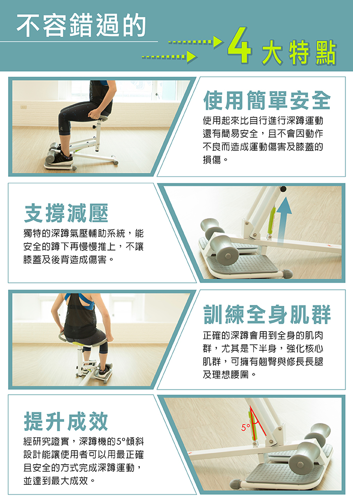 ●「五度傾斜設計」保持最正確深蹲姿勢,輕鬆完成深蹲動作